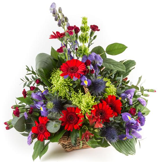 A classic basket and modern blooms fuse together to create a vibrant red, purple and lime display.