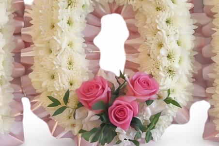 MOM 3 letter tribute, base colour made with chrysanthemum spray, pleated ribbon edge with matching spray.
